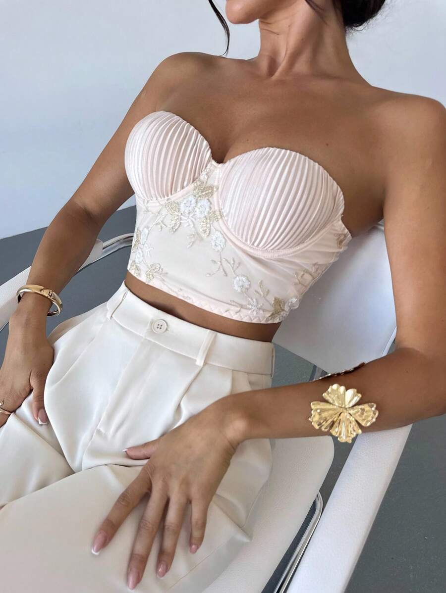 Firerie Women's Elegant Romantic Delicate Sexy Vacation Party Daily Pleated Embroidery Mesh Apricot Tight Bandeau Top, Summer