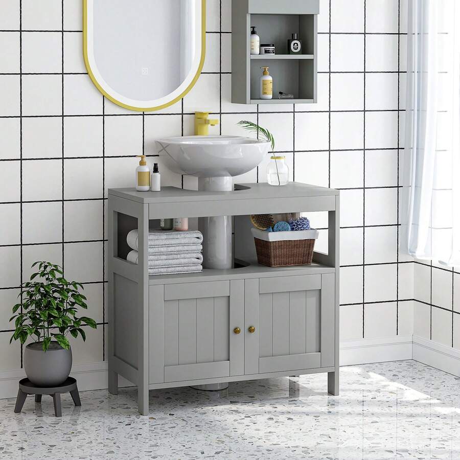 Kleankin Pedestal Under Sink Cabinet With Double Doors, Modern Bathroom Vanity Storage Unit With Shelves