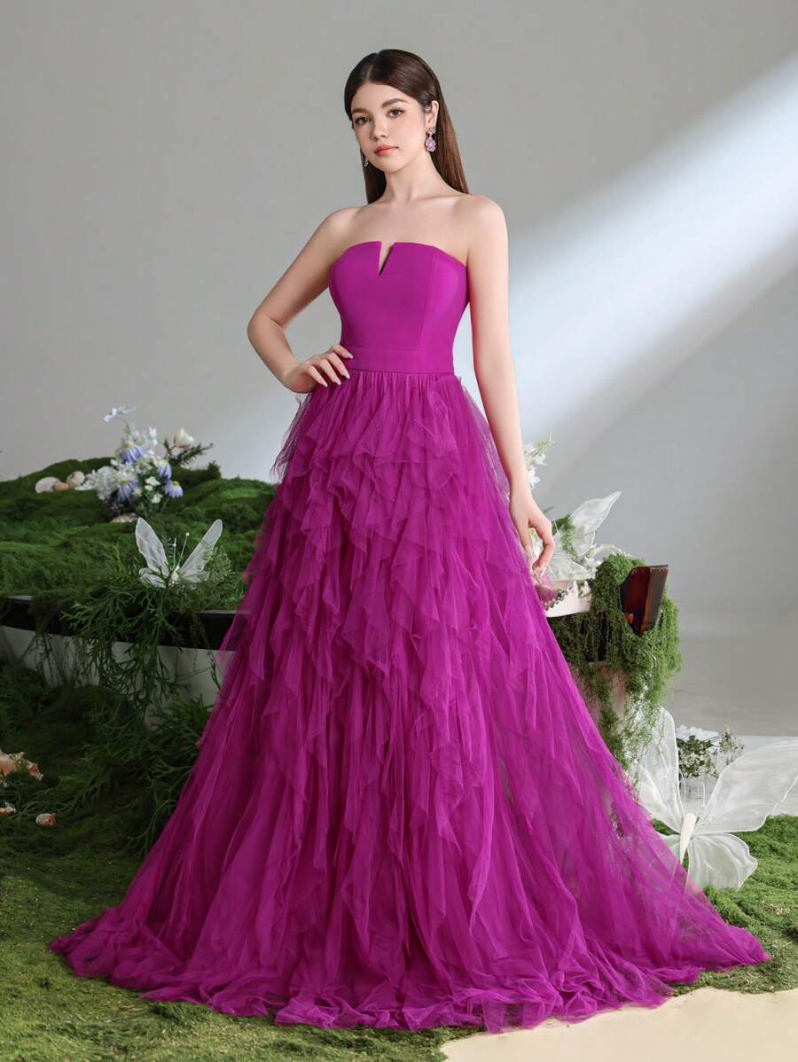Teen Girl Elegant Strapless Party Prom Dress With Multi-Layer Mesh Hem
