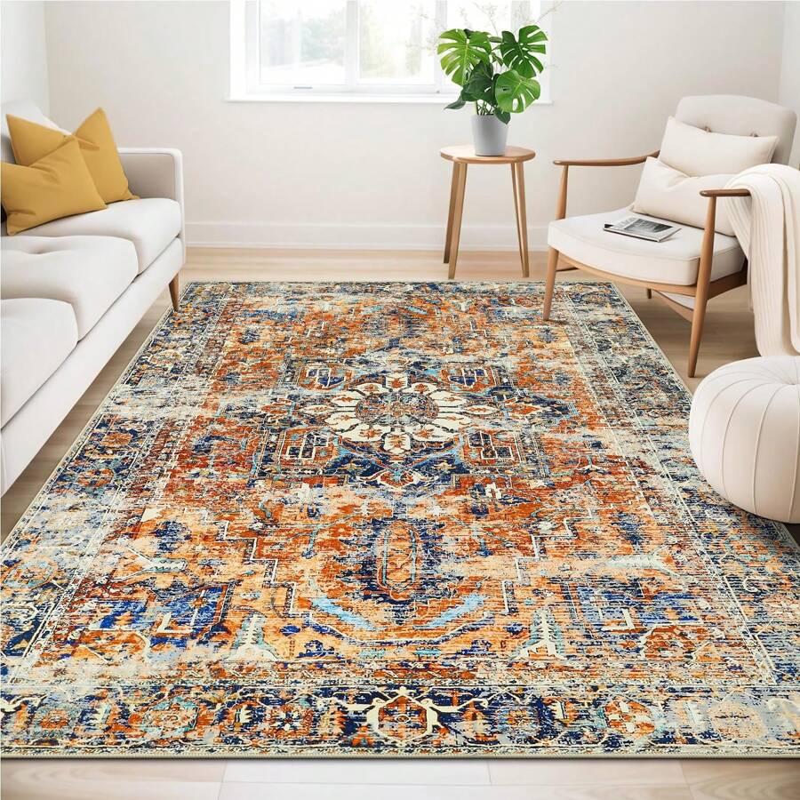 Khaki Bedding Washable Rugs Living Room Area Rugs Orange Vintage Boho Rugs Large Non Slip Carpet Moroccan Rugs Short Pile Rugs For Bedroom Dining Room Kitchen Soft Faux Wool Rugs (80x150cm,120x170cm,200x300cm)