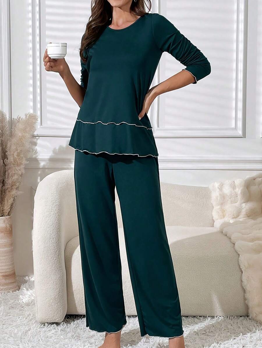 2pcs Women Casual Solid Color Round Neck Long Sleeve Top And Long Pants Pajamas Set, Fall/Winter