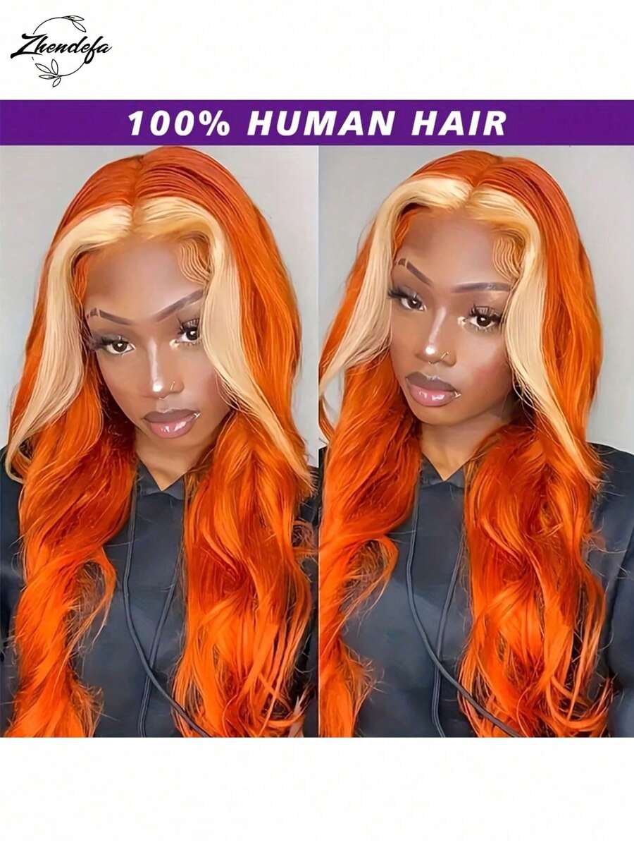 ZHENDEFA Skunk Stripe Wig Ginger Lace Front Wigs Human Hair With Blonde Color 13x4 Body Wave Wig For Orange Ginger Color With 613 Blonde Highlights 150% Density