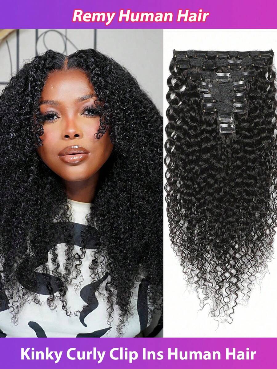 Kinky Curly Clip Ins Human Hair Extensions Natural Color 8Pcs/Set Human Hair Clip Extensions Full Head For Women