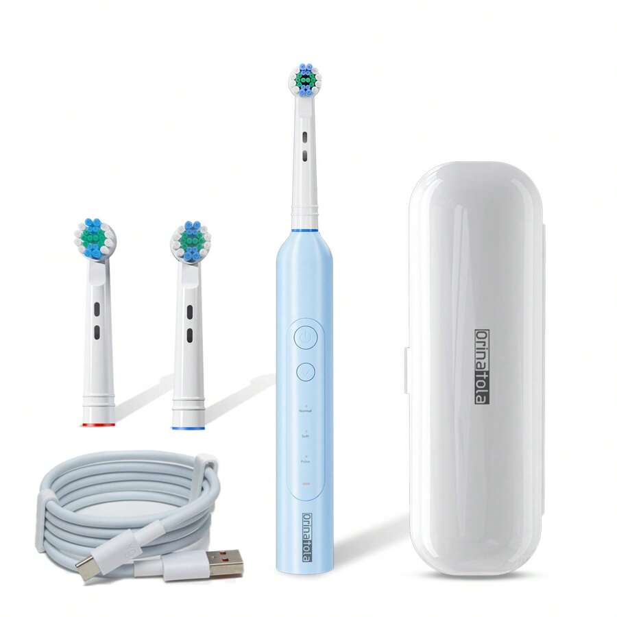 Orinatola Electric Toothbrush, Comes With 2 Brush Heads, USB-C Charging, IPX7 Waterproof, 3 Modes, Includes Travel Case, Can Be Used In Shower, 600mAh Battery, Gift For Wife And Family, Blue