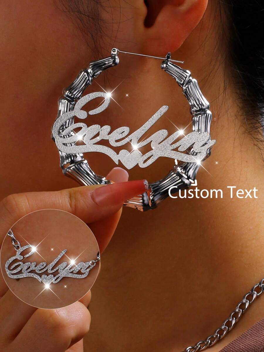 Women's Custom Name Bamboo Earrings Classic Exaggerated Personalized Large Round Earrings Stainless Steel Men's 5mm Cuban Chain Thick Chain Heart-Shaped Pendant Couple Jewelry Set Family Christmas Gift, Silver, Stylish, Colorful, Vintage, Hipster, Simple, Y2k, 2000s Fashion, Custom, Personalized, Unique, Ideal Gifts For Him, Ideal Gifts For Her, Her, Boyfriend, Girlfriend, Dad, Mom, Family, Friends, For Anniversaries, For Birthdays, For Graduation, For Prom, For Party