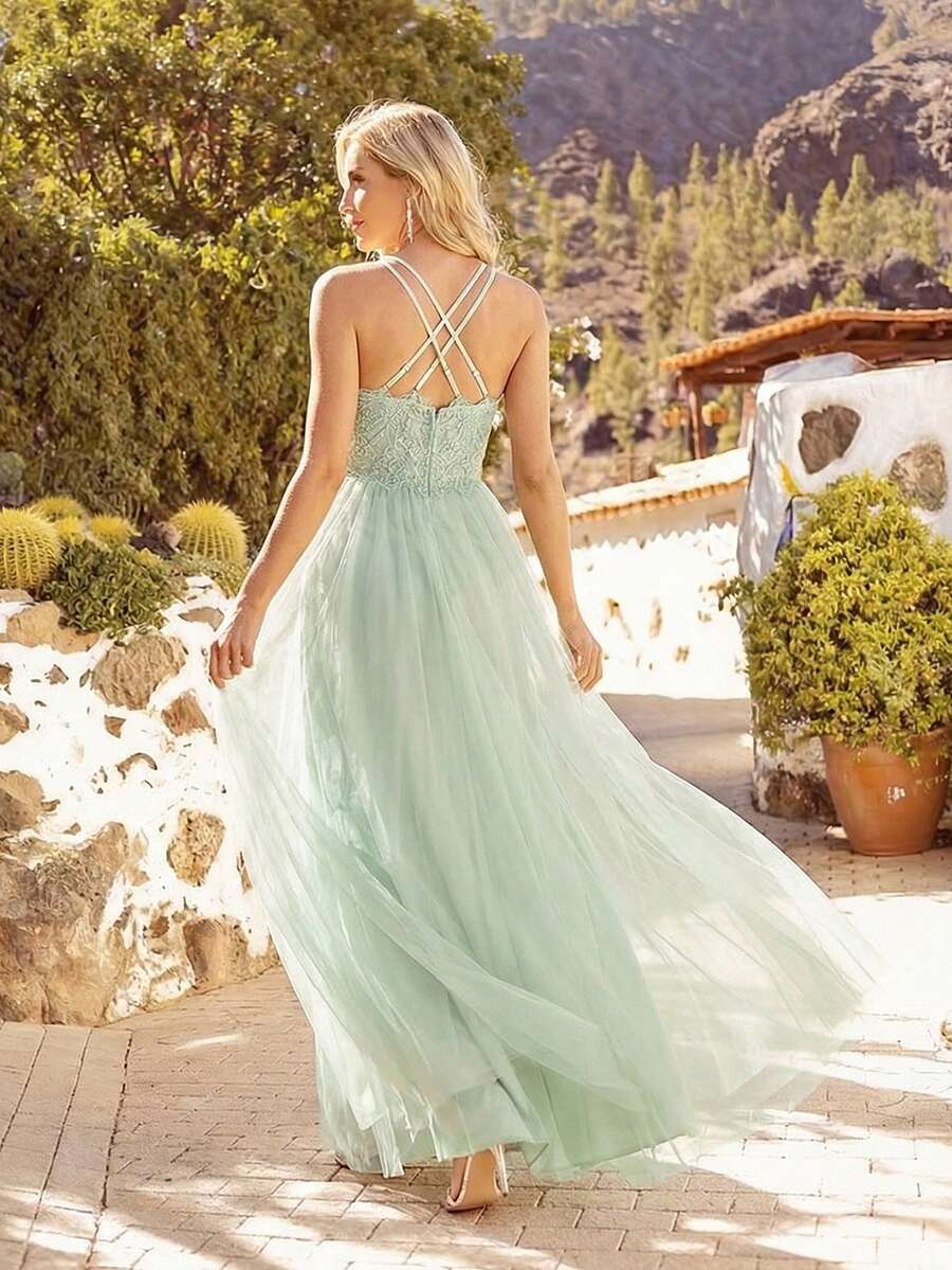 EVERPRETTY Elegant Green Chiffon Dress, Crossover Straps, Lace Back Sheer Fabric, Suitable For Wedding Guest, Formal Dinner, Birthday Party And Other Occasions