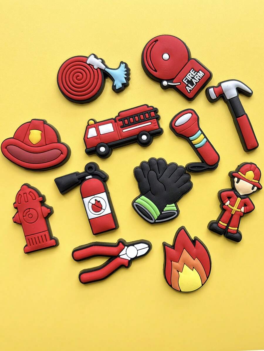 12 PCS Firefighter Series, Firemen, Flames, Fire Extinguishers, Water Pipes, Fire Engines, Fire Caps, Alarm Bells, Etc., Removable, Washable, Cartoon Cute Style, More Beautiful And Attractive, Convey Their Own Elegant Charm, To Show The Elegant Posture Of The Foot And Even The Whole Person