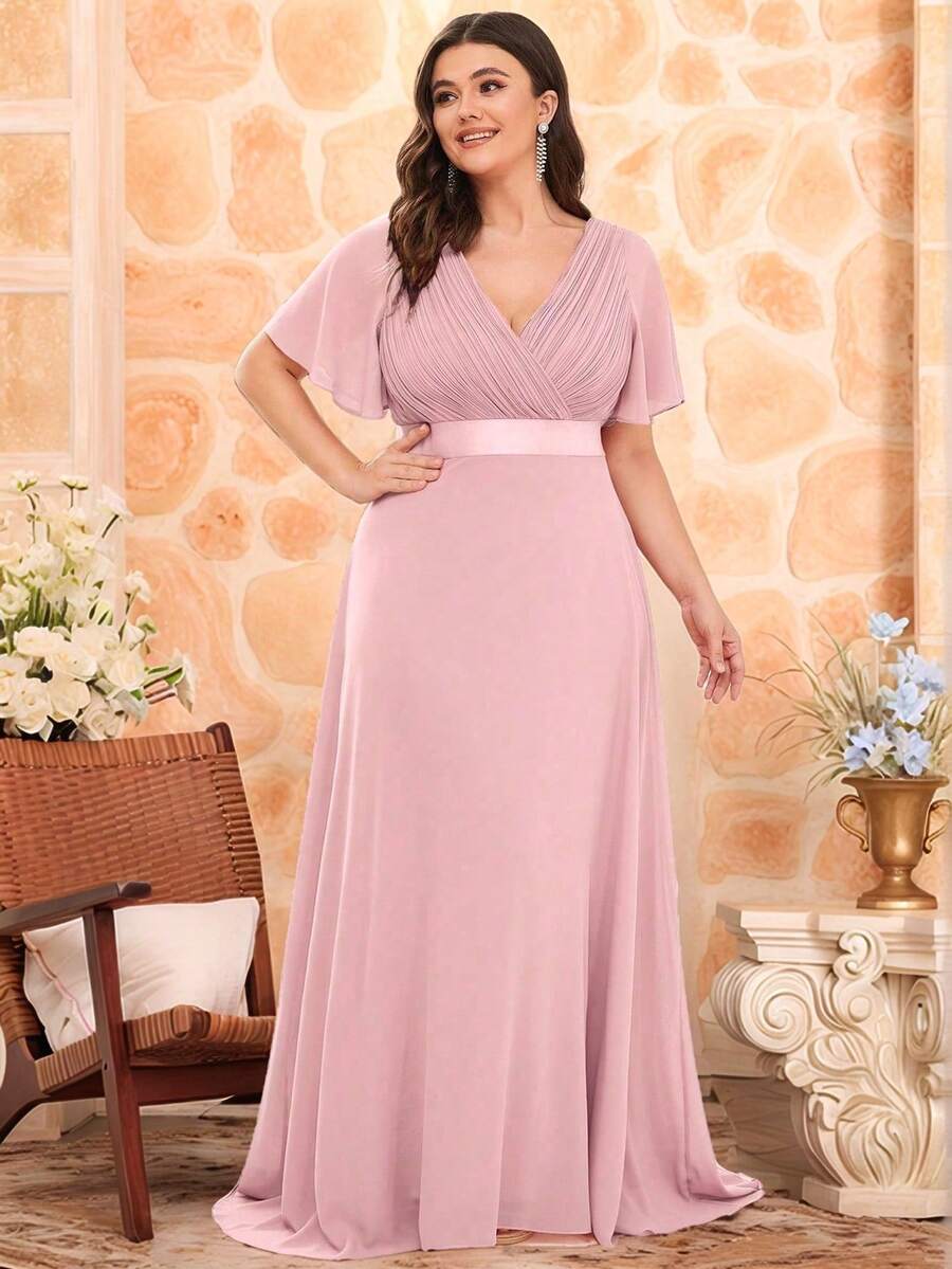 Plus Size Elegant V-Neck Ruched Bust Pink Bridesmaid Dress, Wedding Guest Formal Dress For Wedding Dinner, Birthday Party, Valentine's Day