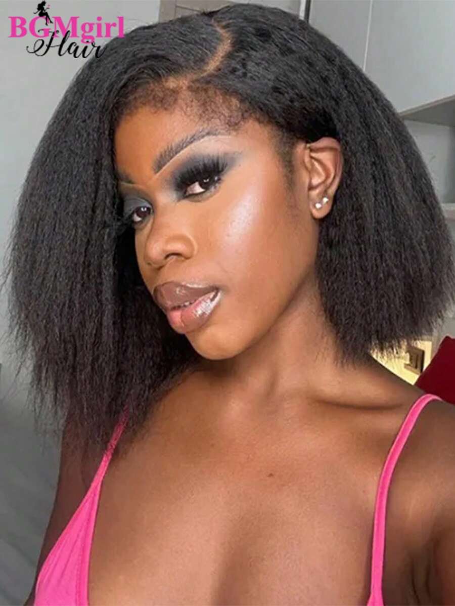 BGMGIRL Wear Go Glueless Wigs Pre Bleached Knots Kinky Straight Bob 180% 8-14 Inches Hair 6x4 Pre Cut & Pre Plucked Transparent Lace Closure Wigs Natural Color Hairline For Women Beginners