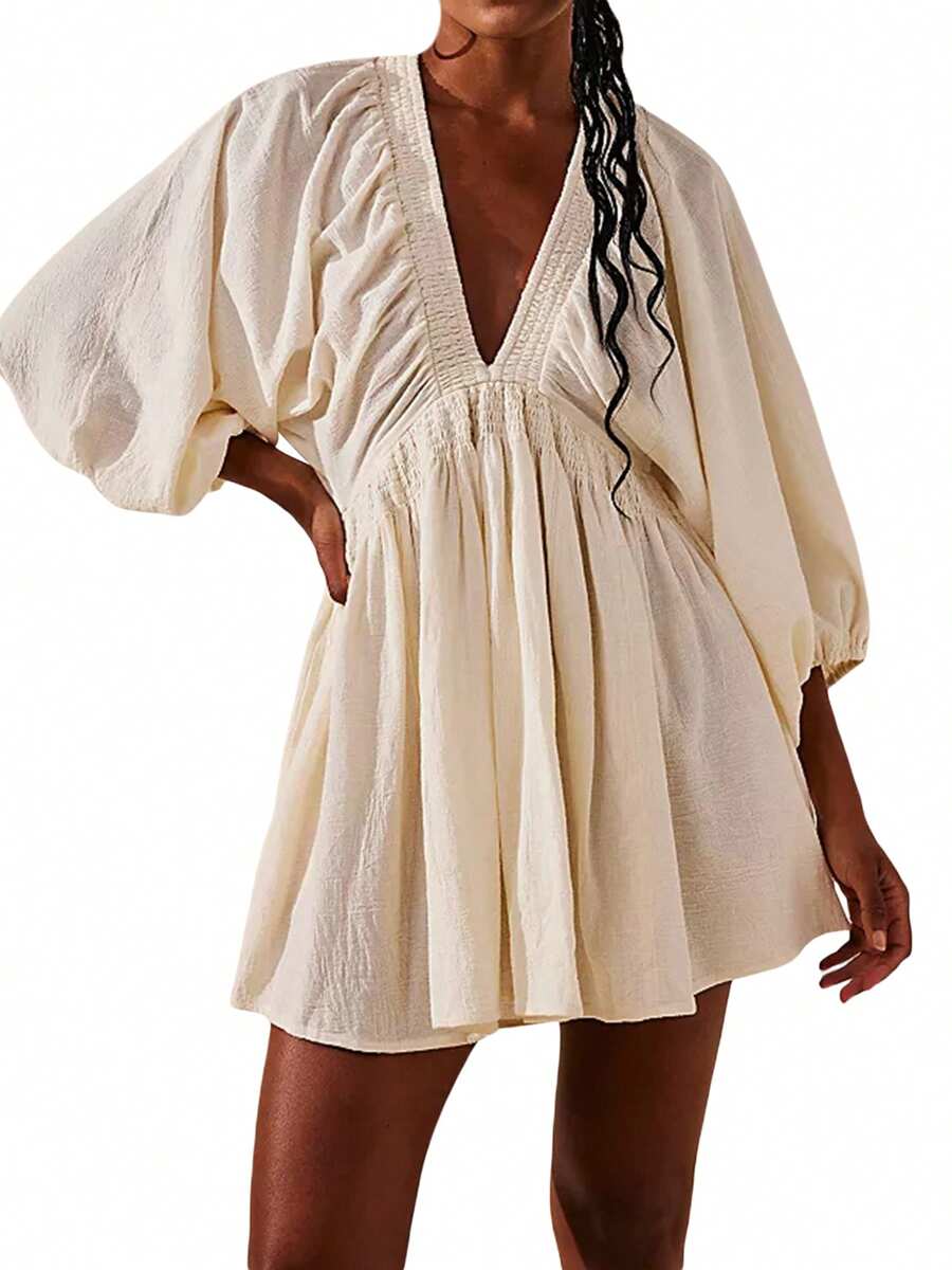 Women's Summer Short Party Dresses 3/4 Sleeve Deep V Neck Solid Color Smocked Dress With Pockets