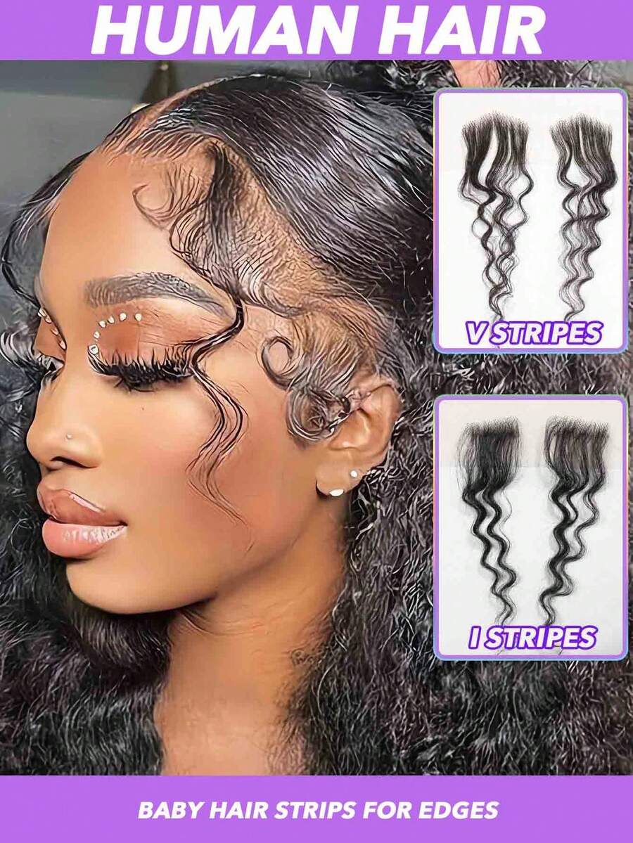 V/I Shape Reusable Edges Hair Top Transparent Lace Edges Hair Extensions, Soft & Natural Fake Baby Hair Edges For , Handmade Real Human Hair Pieces, Natural Black Color 2 PcsL Deep Wave/Curly Wave/Water Wave