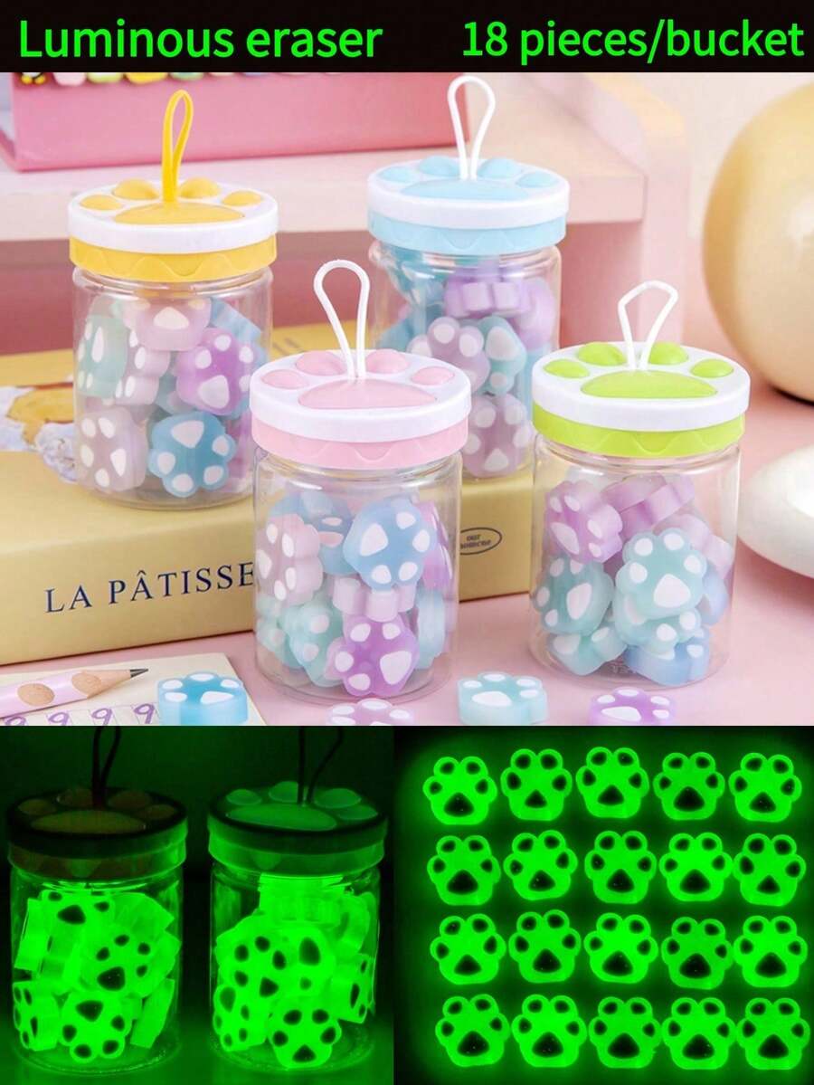 18pcs Glow-In-The-Dark Cat Paw Crystal Eraser Set, Student Exam Reward, Birthday Gift,Back To School