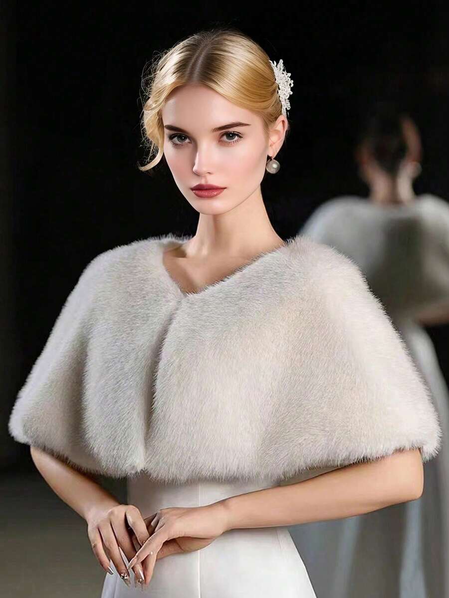 1 Piece Of Women's Milk White Faux Fur Fox Fur Shawl Cape Party Wedding Dress, Paired With A Short Cloak Jacket For Autumn And Winter Warmth Holiday Gift Warm Plush Shawl