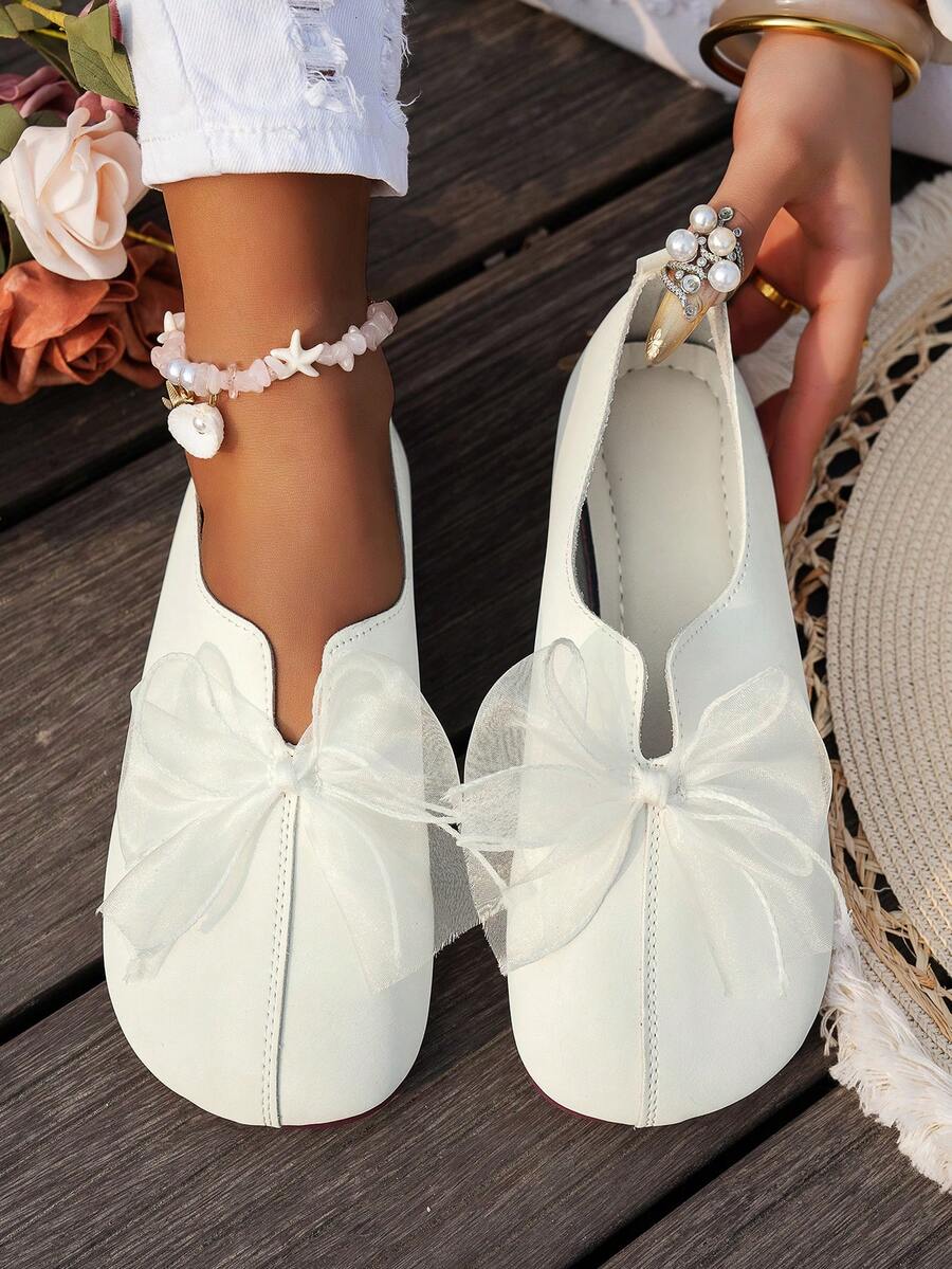 Women Casual Solid Color Soft Outsole Round Toe Ballet Flats With Bow Decor, Fashionable Slip-On Loafers