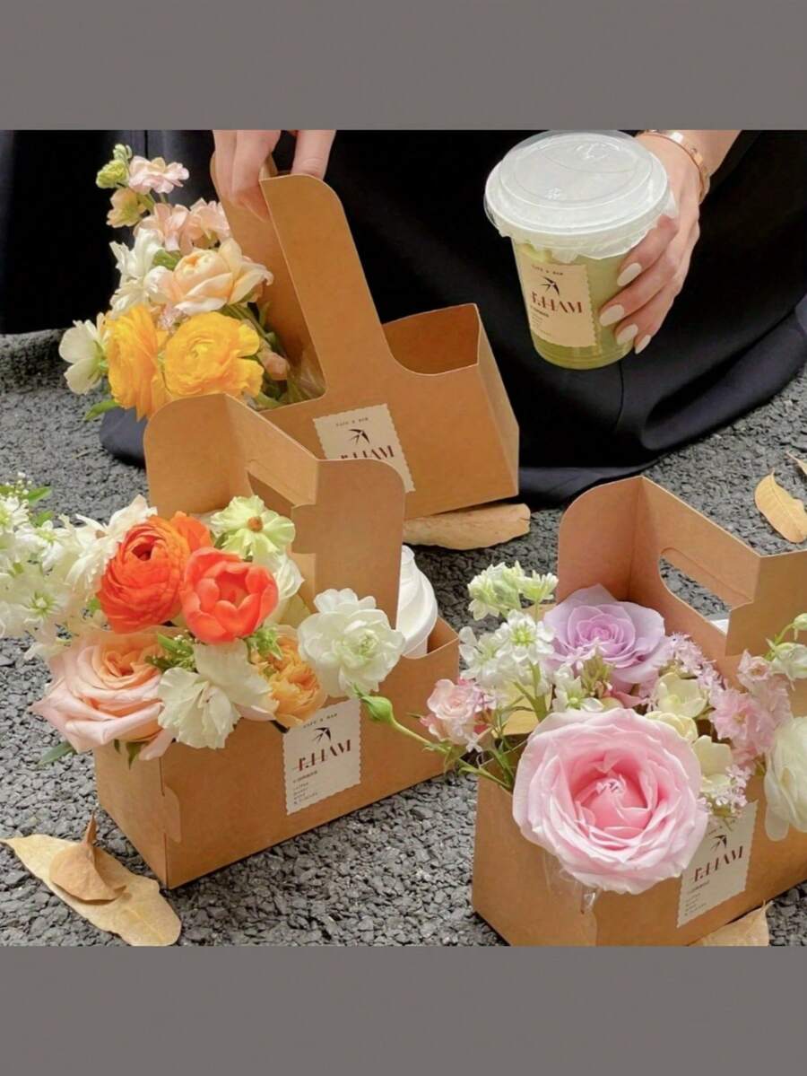 10/15 Kraft Paper Coffee Holder With Handle, Double Compartment Portable Takeaway Beverage Holder, Takeaway Paper Cup Holder (White, Brown, Pink), Event Party Box, Kraft Paper Flower Basket, Hot Or Cold Drink Cup Holder, Milk Tea Holder, Takeaway Box, Dessert Cake Bouquet Box, Wedding Gift, Floral Accessories, Suitable For Wedding Party, Office, Outdoor.