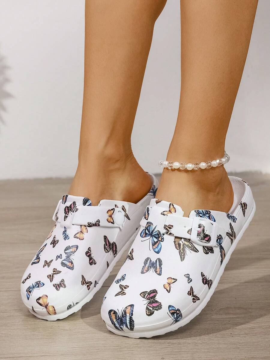 Women's Fashion Slip-On Nurse Shoes, White EVA Flat Slippers With Butterfly Water Print, Protective Toe Work Shoes For Doctors/Nurses, Non-Slip & Wear-Resistant