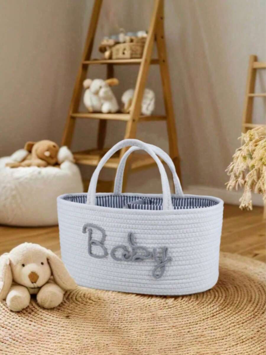 1pc Baby Diaper Basket, Toy Storage Basket, Portable Woven Divided Organizer Basket With Removable Liner, Letter Design Woven Storage Basket For Nursery Supplies