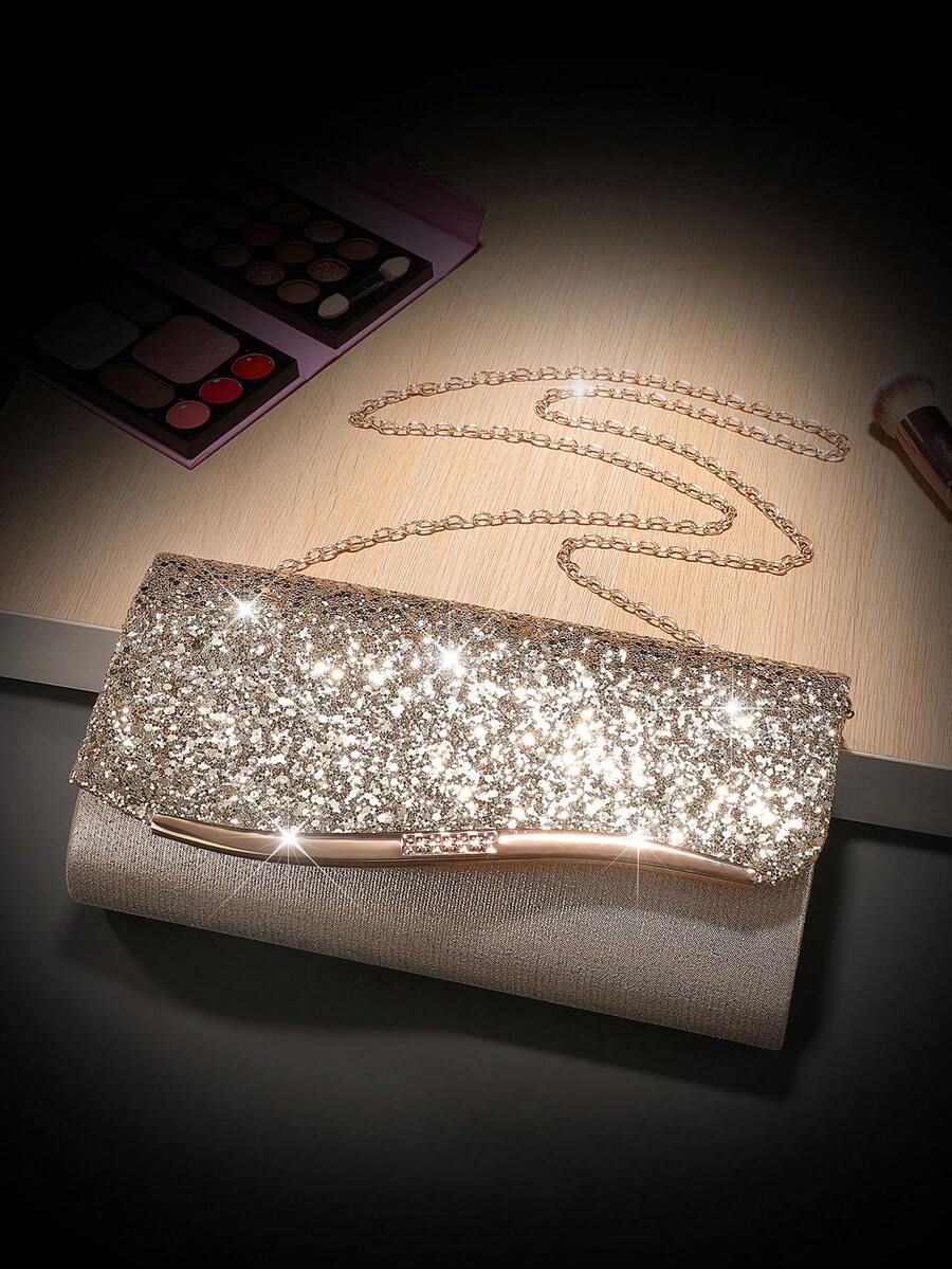 1pc Fashion Metal Edged Korean Style Women's Dinner Party Handbag With Magnetic Clasp, Shoulder & Clutch Bag, Satin Material