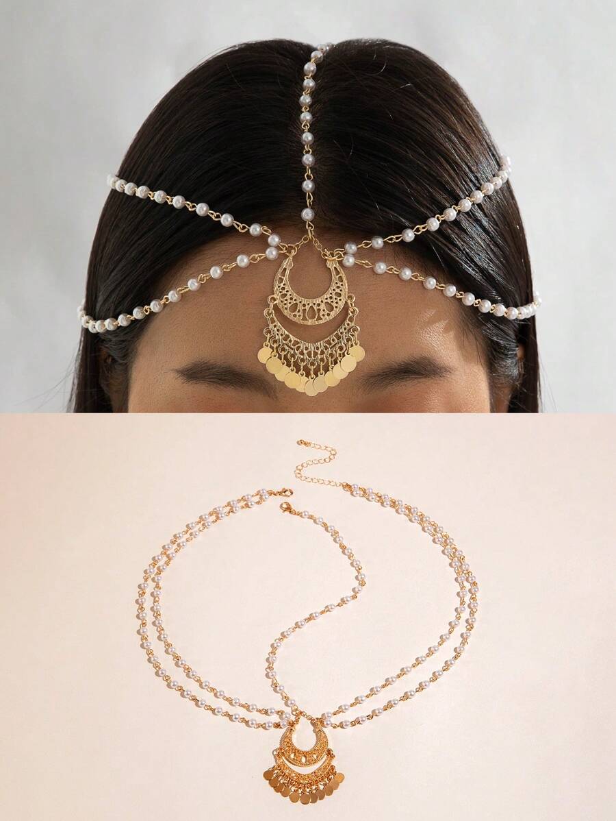 imoli 1pc Minimalist Iron Chain Crescent Moon & Tassel Basic Chain Headpiece, Party Gift (Handmade, Length Customizable, Disc Quantity Varies)